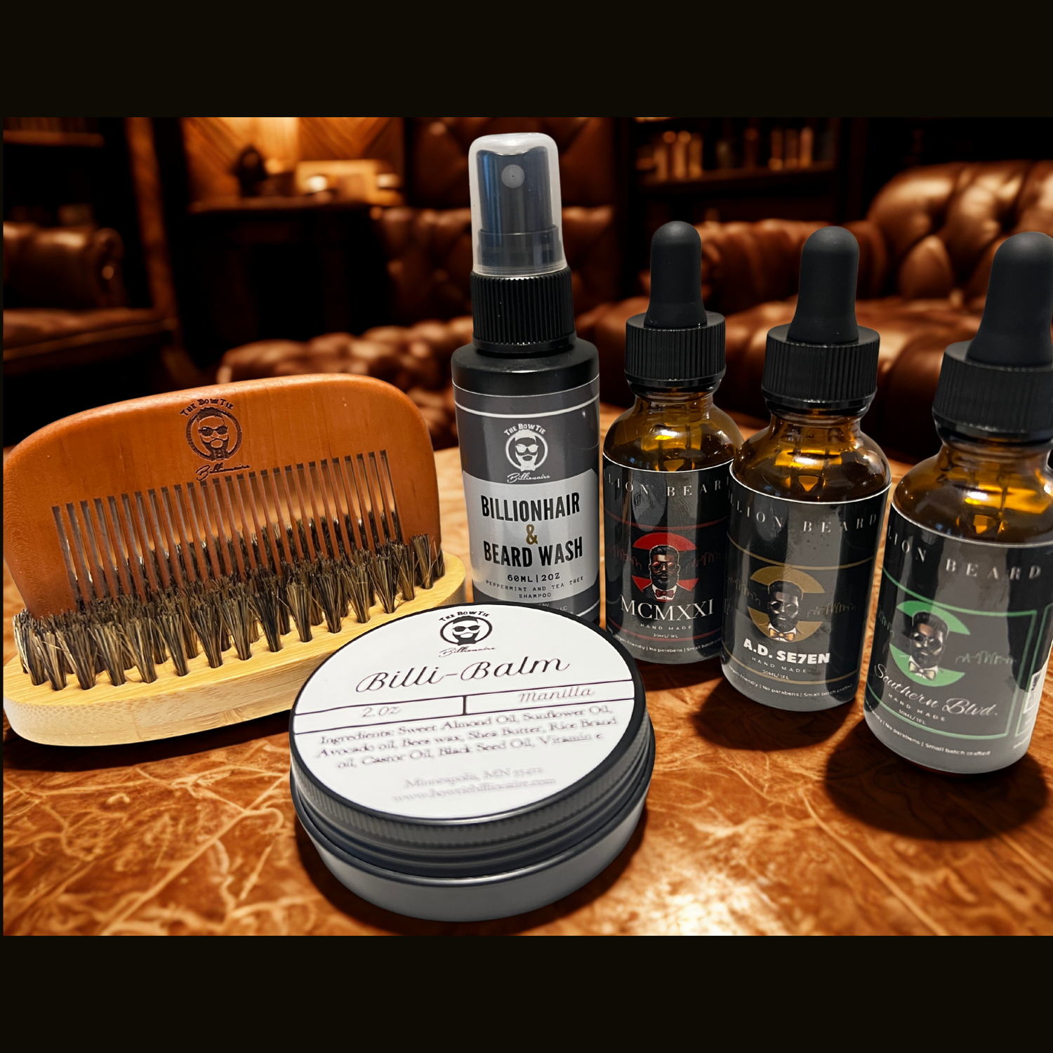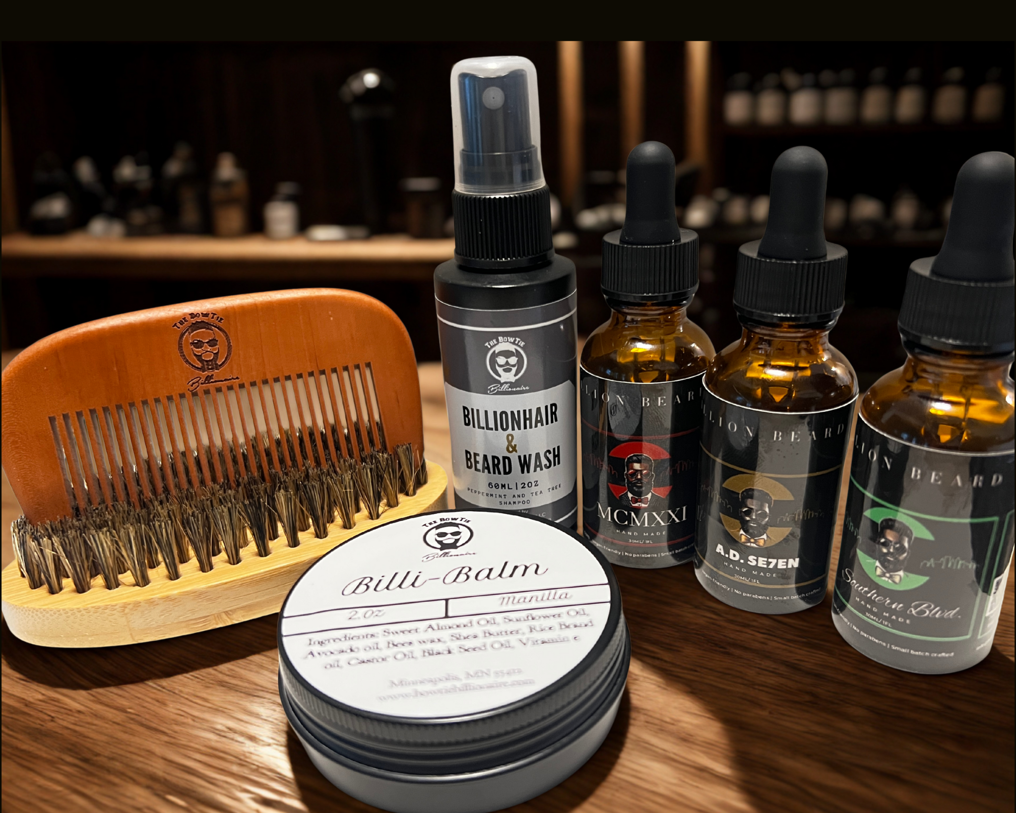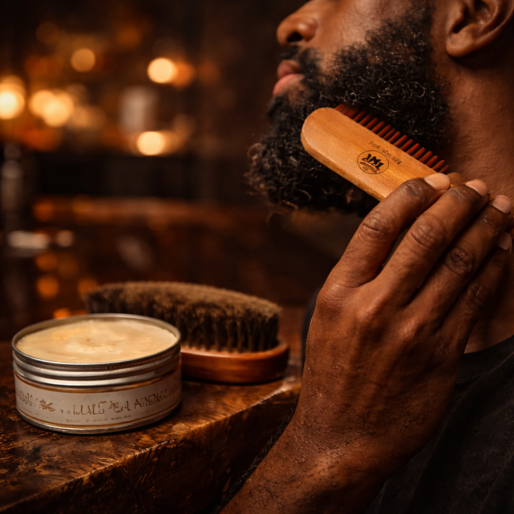 Beard wash, beard oil, balm, brush, comb. Built for daily use.